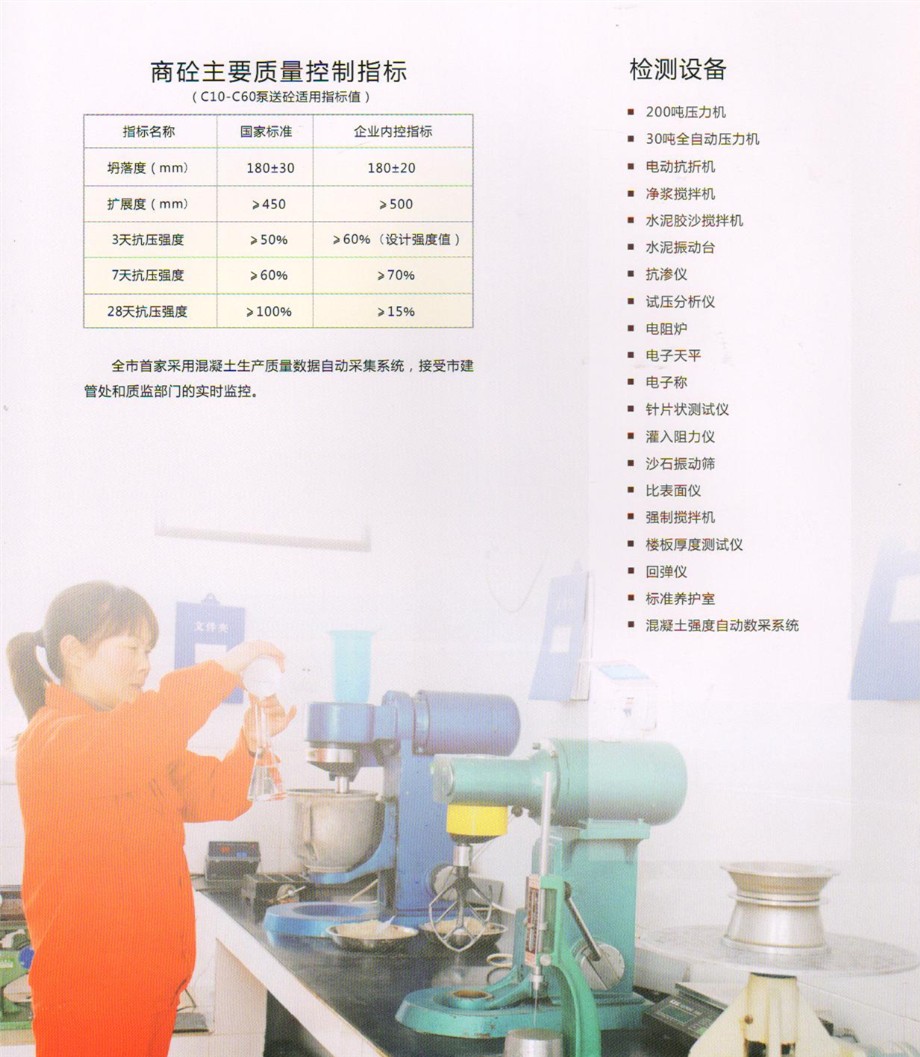 公司設有先進的實驗室,配備全套混凝土及原材料檢測試驗設備,配有專職的試驗、檢驗人員,可承擔混凝土的材料性能試驗,工藝質量控制、產品質量檢驗等全部試驗、檢驗項目,為確;炷临|量提供了可靠的保證。